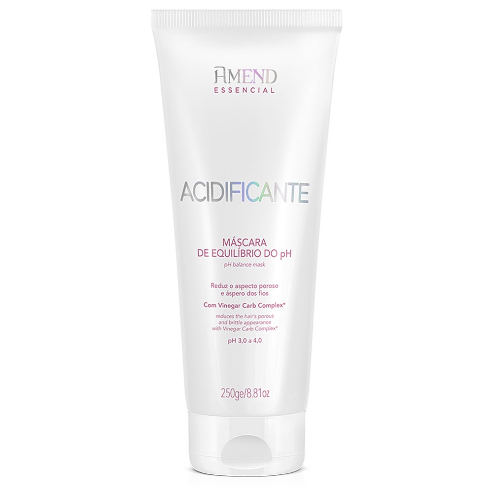 A Amend Essencial Acidificante Máscara de Equilíbrio do pH 250g foi desenvolvida para cabelos ásperos, porosos e desidratados, especialmente os que passaram por processos químicos como coloração, descoloração ou alisamentos, além da exposição frequente ao calor de secador e chapinha. Sua fórmula contém o exclusivo Vinegar Carb Complex, uma combinação de vinagre de frutas ácidas (maçã, limão e tamarindo), aminoácidos e carboidratos que reequilibram o pH da fibra capilar, selam as cutículas e permitem maior retenção de água. O resultado são fios hidratados, disciplinados, com menos frizz e mais resistência.