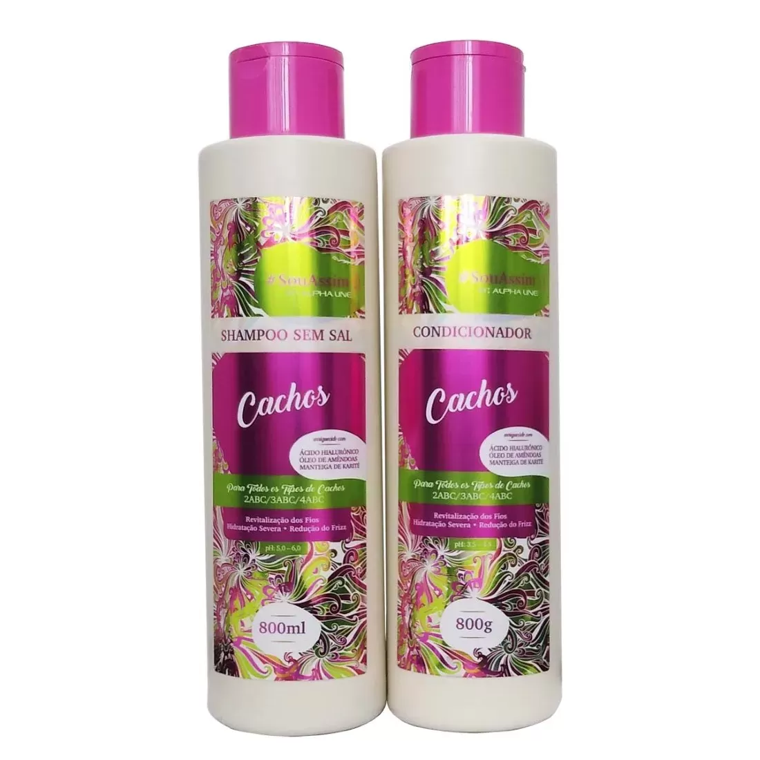 O Kit Alpha Line Sou Assim Cachos contém shampoo e condicionador de 800ml cada, formulados para atender às necessidades dos cabelos cacheados. Sua composição inclui bio elixir de óleos vegetais e ativos hidratantes, que nutrem profundamente os fios, promovendo definição, maciez e brilho. O shampoo é sem sal, com pH entre 5,0 e 6,0, enquanto o condicionador possui pH entre 3,5 e 4,5, garantindo equilíbrio e cuidado diário para cachos mais saudáveis e bonitos.