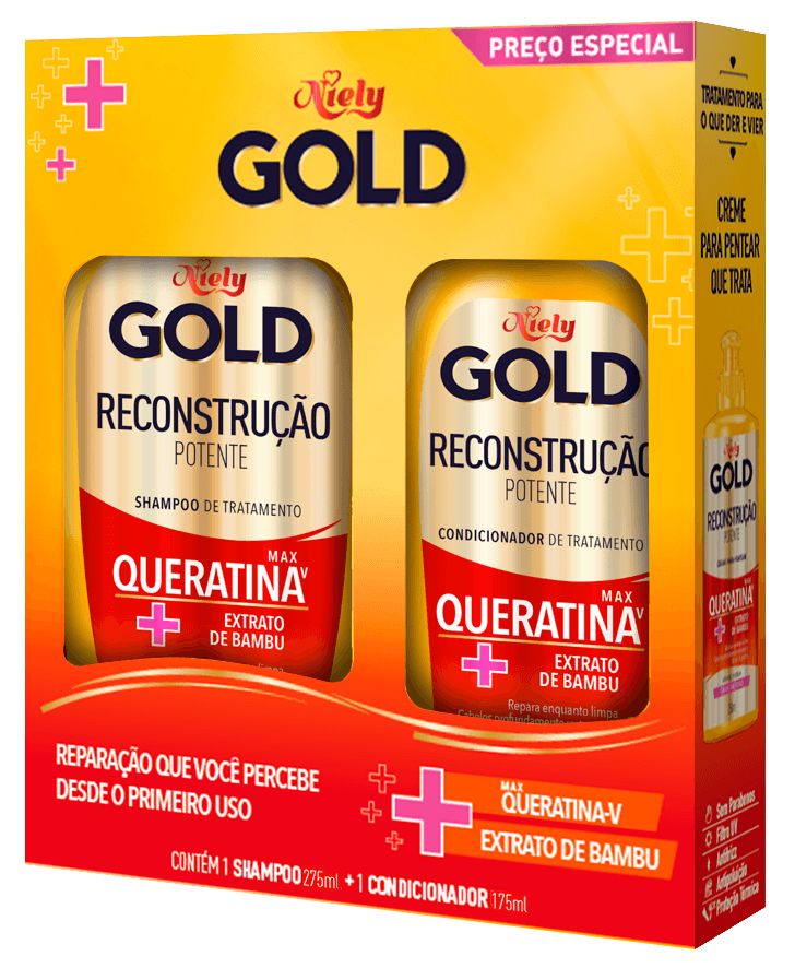 O Kit Niely Gold Reconstrução Potente combina Shampoo 275ml e Condicionador 175ml, desenvolvidos para cabelos danificados e fragilizados. Sua fórmula contém queratina e ceramidas, que atuam na reconstrução da fibra capilar, devolvendo força, resistência e brilho. O shampoo promove limpeza suave sem agredir os fios, enquanto o condicionador hidrata, desembaraça e sela as cutículas. Indicado para uso diário, o kit garante cabelos mais saudáveis e revitalizados.