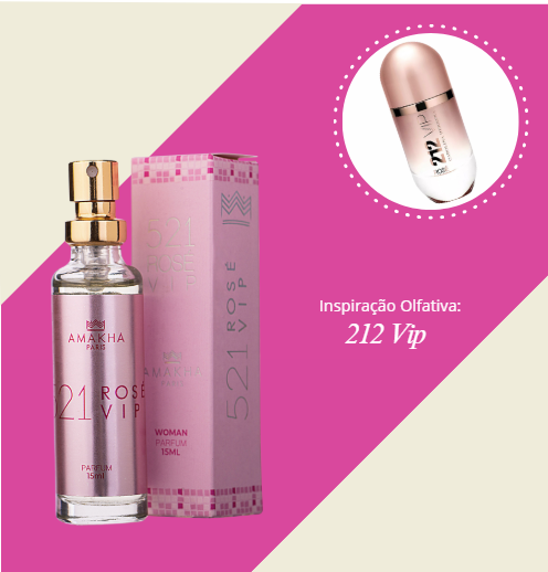 O Perfume Amakha Paris 521 Vip Rosé 15ml é uma fragrância feminina sofisticada e refrescante, inspirada no famoso 212 VIP Rosé da Carolina Herrera. Com notas florais e frutadas, é ideal para mulheres autênticas, comunicativas e elegantes. A presença da flor de pêssego confere delicadeza, enquanto o almíscar branco adiciona suavidade e sensualidade. A embalagem spray de 15ml é prática e perfeita para levar na bolsa. Produto vegano, com alta concentração e excelente fixação