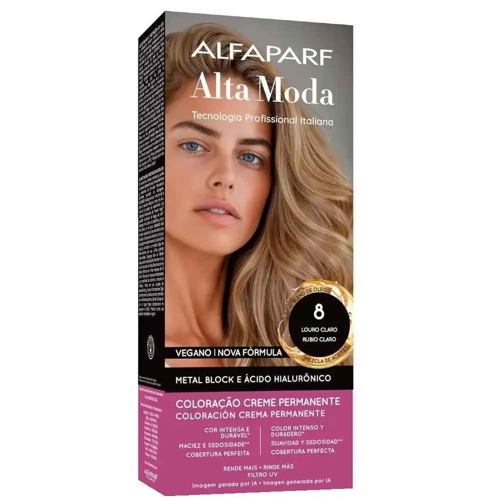 A Tintura Alta Moda É... 8 Louro Claro 150g é uma coloração permanente da Alfaparf, desenvolvida com tecnologia italiana para resultados profissionais. Sua fórmula cremosa com pigmentos micronizados garante fixação profunda e uniforme da cor, proporcionando cobertura total dos fios brancos. Com fragrância suave e textura fácil de aplicar, é indicada para quem busca um tom loiro claro moderno, elegante e cheio de luminosidade. Embalagem prática de 150g, ideal para uso doméstico ou profissional.