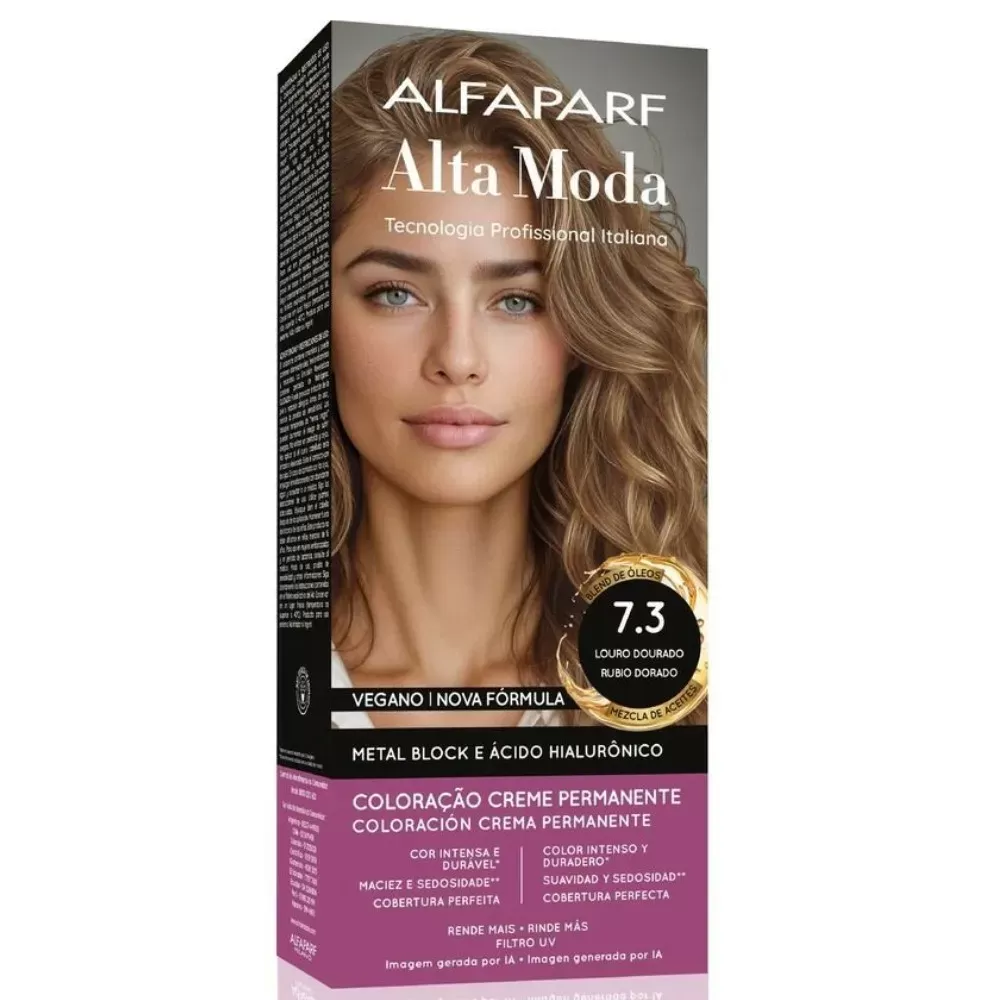 A Tintura Alta Moda 7.3 Louro Dourado 150g é uma coloração permanente desenvolvida pela Alfaparf, marca italiana reconhecida pela excelência em cosméticos capilares. Sua fórmula contém pigmentos micronizados de alta fixação, que proporcionam cor intensa e duradoura. A textura cremosa facilita a aplicação e a fragrância suave torna o processo mais agradável. Embalada em bisnaga prática, é indicada para quem deseja conquistar um tom loiro dourado sofisticado, com aspecto saudável e luminoso.